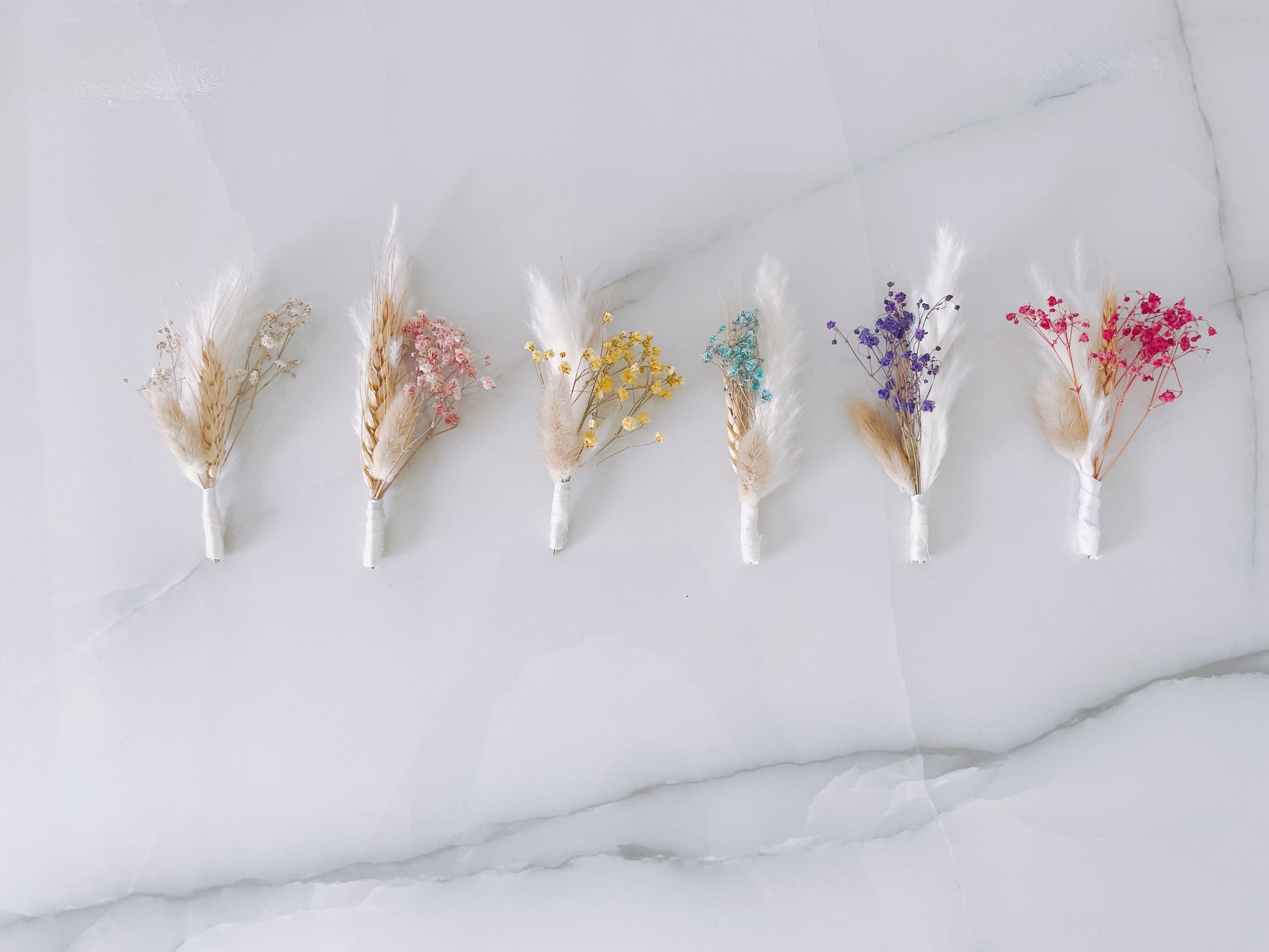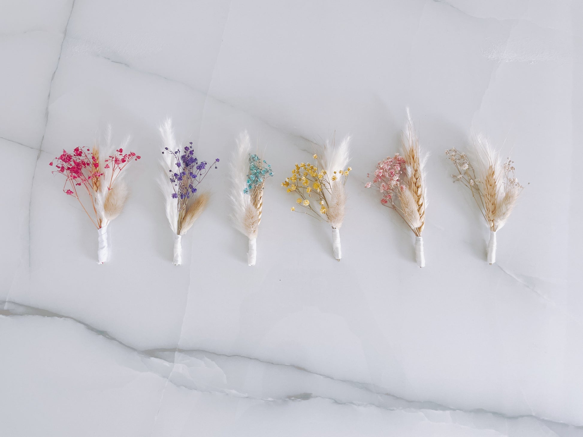 Pampas Grass+Baby’s Breathe+Bunny Tails+Pink+Blue+Cream+Purple+Red+ Yellow+Leaf Boutonniere, Spring Wedding, Summer Wedding Boutonniere, Wedding Boutonniere, Groomsmen Boho Boutonniere